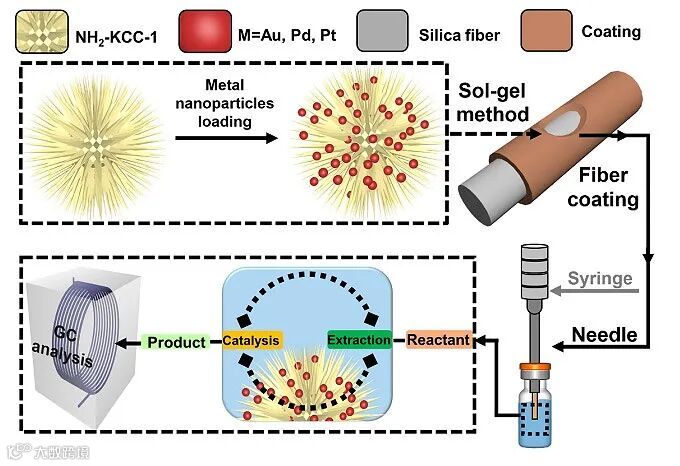 鉴于此,中国石油大学(华东)曾景斌教授课题组提出了一种原位催化和萃取一体化的方法,通过将不同类型的金属纳米颗粒(M=Au、Pt和Pd)沉积分散到纤维状介孔硅球(KCC-1)表面,制备了几种不同类型的M/KCC-1非均相催化剂,进一步通过溶胶-凝胶法使M/KCC-1材料涂覆在带有羟基的石英纤维(直径:150 μm)表面,使涂层同时进行原位催化反应、萃取反应物和产物。待反应结束,直接将纤维进入色谱进样口进行反应物和产物的解吸分析,实现非均相催化反应的快速评价。在这个过程中,该涂层不仅起到催化剂的作用,同时还可以作为吸附剂,实现反应体系中的反应物、产物和中间体的富集。实验首先以Au/KCC-1纤维为例,选择了几个典型的非均相催化反应,包括对硝基苯酚的还原、苯甲醇的氧化以及苯乙烯的环氧化等反应过程进行评价。结果表明,利用此方法均可实现对上述反应不同产物的产率、选择性和催化反应动力学过程的评价。为证明此方法的普适性,进一步将Pt/KCC-1和Pd/KCC-1涂层分别用于催化邻硝基苯胺的还原和对氯苯酚的脱氯反应,均检测到了反应物和产物,证明了该方法的普适性。