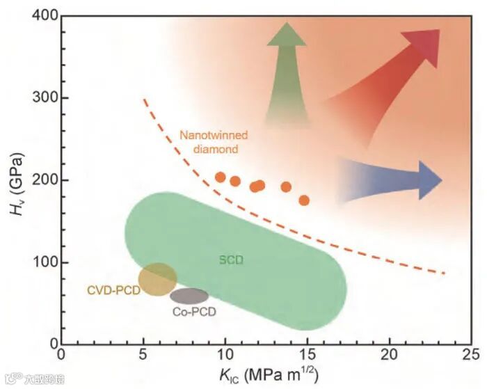 金刚石的硬度与断裂韧性关系图,橘色虚线表示传统的硬度与断裂韧性的关系。图片来源:《科学通报》[1]