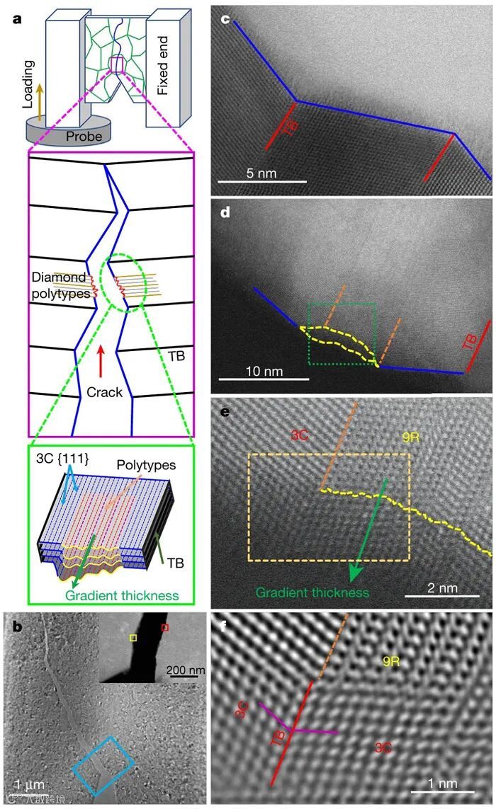另一方面,这种纳米孪晶金刚石复合材料具有复杂的层次结构,使得在断裂测试中,裂纹沿着3C纳米晶的{111}面延伸。但当裂纹遇到非3C型区域时,在孪晶界短暂停滞,传播方向发生改变,偏转到另一个孪晶畴中,再次沿着{111}平面移动。这导致了裂纹形成锯齿状路径,在一定程度上缓冲了断裂的能量,提高了材料的韧性。