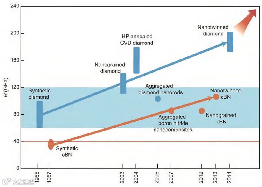 合成金刚石和cBN材料硬度历史年表,红线表示超硬材料的阈值(40 GPa),青色阴影区表示天然金刚石单晶的硬度范围(60~120 GPa)。图片来源:《科学通报》[1]
