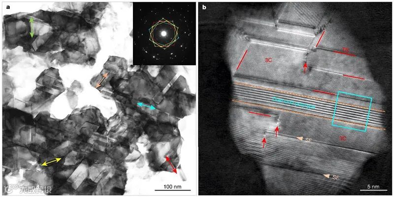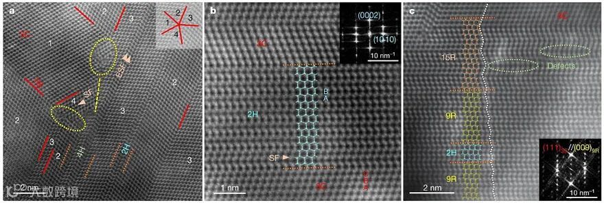 研究者利用洋葱碳材料作为前驱体,高温高压条件下合成了纳米孪晶金刚石复合材料。材料由多种金刚石多型体组成,其中2H、4H、9R和15R四种金刚石多型体与3C型金刚石界面相邻,属于孪生共晶。在高压合成过程中,洋葱碳结构中的sp2杂化碳原子收缩成碳双层膜,并在相邻的双层膜之间形成sp3杂化的C−C键。