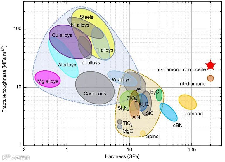 纳米孪晶金刚石复合材料和典型工程材料的硬度和断裂韧性对比。图片来源:Nature