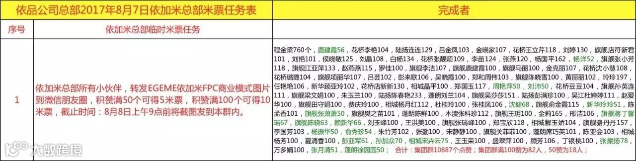 昨天下午15:30分,短短2小时,通过米票任务,EGEME依加米集团群总部同事分享出去的图文已经有30887人支持。其中还未包括11家门店和皇后餐厅的米粉们分享出去的数据。