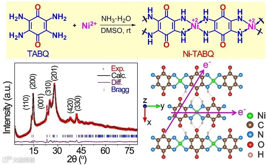 图1. Ni-TABQ的合成路线及其XRD衍射数据和电子传导方向示意图。图片来源:Angew. Chem. Int. Ed.