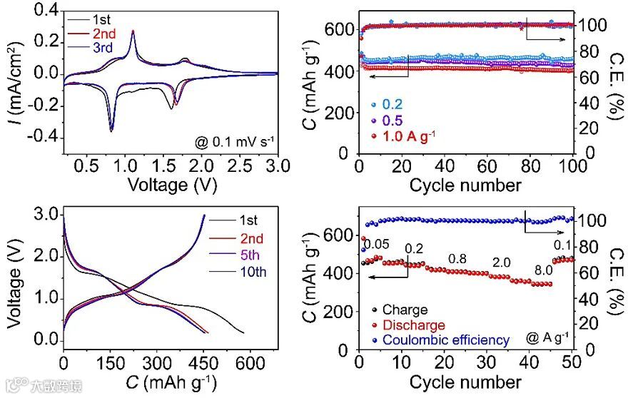 最后,作者对Ni-TABQ的电化学性能进行了测试。结果表明,Ni-TABQ展现出优异的电化学稳定性,在100 mA g-1和8 A g-1时分别具有~469.5 mAh g-1和345.4 mAh g-1的高比容量,并且在8 A g-1的电流密度下循环450圈容量保持率达88.5%。此外,以Ni-TABQ为负极和Na3V2(PO4)2F3为正极组装的钠离子全电池也展现出高的倍率性能和长循环稳定性。