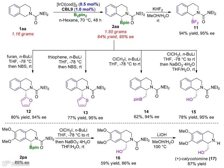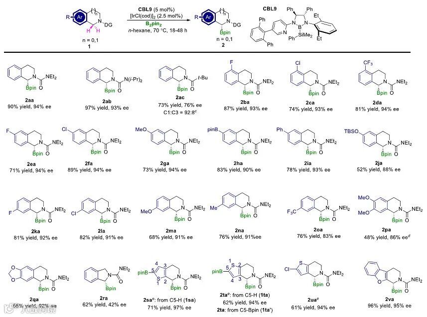 作者选取四氢异喹啉1aa为标准底物对反应条件进行了优化,最终发现在CBL9(5 mol%),[IrCl(cod)]2 (2.5 mol%), B2pin2 (1.5 equiv), n-hexane (0.1 M),70 °C和18 h的条件下以90%的收率和94%的ee值得到目标碳氢键硼化产物2aa,值得一提的是,该反应的区域选择性与文献已知的其它不对称碳氢键官能团化反应正好互补。在得到最优的反应条件后,作者对四氢异喹啉类底物范围进行了拓展(图2),均能以良好到优秀的对映选择性得到相应的硼化产物(2aa-va)。