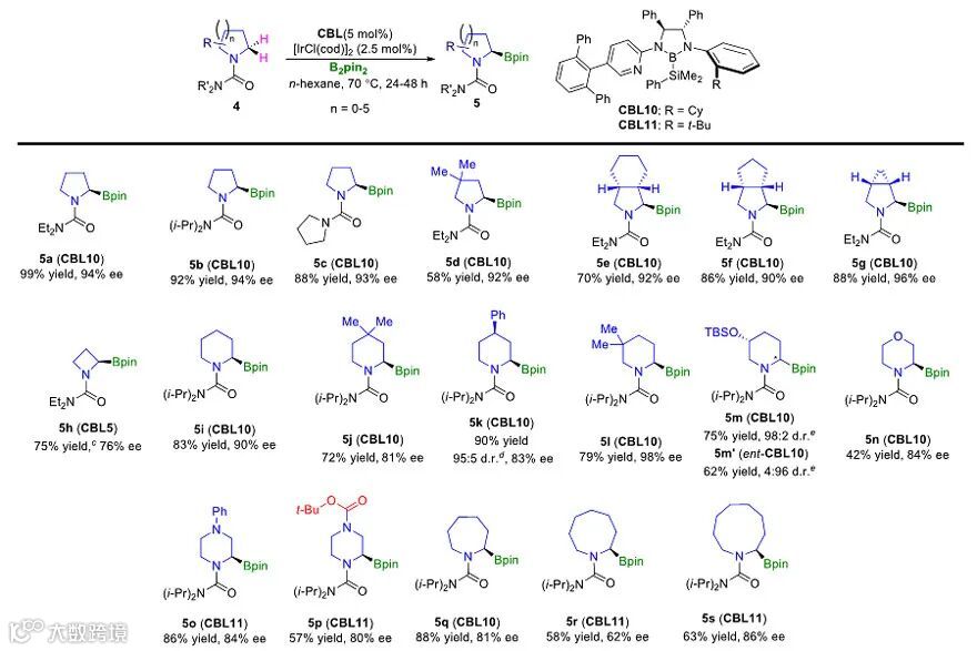 随后,作者通过对配体的进一步优化,实现了饱和环状胺类化合物α-位的不对称碳氢键硼化反应,最高ee值可达98%。该反应不仅能够适用于4-9元环体系(4a-m 和5q-s),而且也能应用于吗啉和哌嗪类底物(5n-p)。