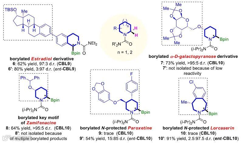 图4. 生物活性分子相关的环状胺后期硼化反应