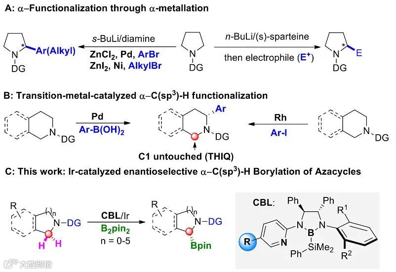 中科院兰化所苏州研究院徐森苗研究员课题组一直致力于过渡金属催化的有机硼化合物的选择性合成:一是通过发展新的策略实现碳-碳双键的区域和立体选择性硼氢化反应(Org. Lett., 2017, 19, 3676; Chem. Sci., 2018, 9, 5855; Angew. Chem. Int. Ed., 2019, 58, 8187;Org. Lett., 2020, 22, 2861);二是通过发展新型手性硼基配体(CBL),实现碳-氢键的不对称硼化反应(J. Am. Chem. Soc., 2019, 141, 5334; J. Am. Chem. Soc., 2019, 141, 10599;Chin. J. Chem., 2020, doi.org/10.1002/cjoc.202000240)。最近,徐森苗研究员课题组利用改进的CBL,以优异地对映选择性实现了环状胺类α-位的不对称碳氢键硼化反应(图1C)。