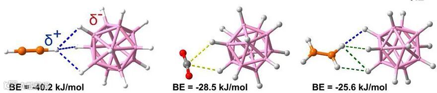 图1. DFT计算得到的[B12H12]2-和C2H2、CO2、C2H4的结合能