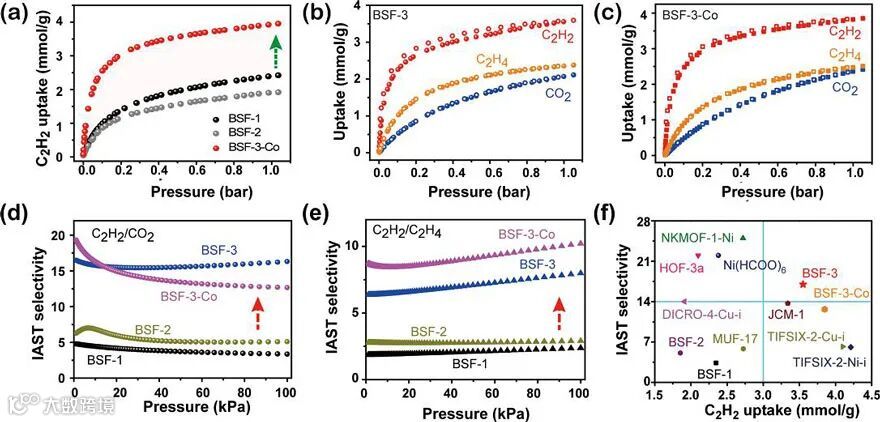 图4. (a) BSF-1、BSF-2和BSF-3在298 K下的乙炔吸附等温线;(b,c) BSF-3和BSF-3-Co在298 K下的C2H2、CO2和C2H4的吸附等温线;(d, e) BSF-3和BSF-3-Co的C2H2/CO2和C2H2/C2H4的IAST分离选择性;(f) 代表性材料的C2H2/CO2的分离性能的比较。