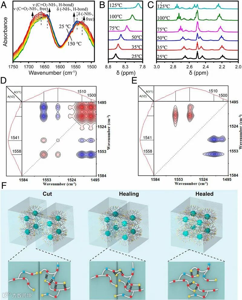 作者通过不同温度下的红外光谱研究了RHP中氢键变化(图4A)。从结果中可得室温条件下在1640和1544 cm-1处有峰出现,这是酰胺与-NH-形成的氢键产生的峰。而随着温度从25 ℃增加到150 ℃时在1544和1640 cm-1处峰强度降低,而1659 cm-1(属于游离酰胺基团)和1530 cm-1(属于游离-NH-基团)处峰强度增加,这说明随着温度升高氢键逐步解离。在核磁共振氢谱图结果中也可以得到相同的结果(图4B)。氢键的解离过程在25 ℃可观察到,表明部分氢键在室温下就很活跃,这能促进室温下RHP的自愈过程。为了进一步研究RHP在Tg处的动态变化,作者研究了20~40 ℃下-NH-振动的二维相关红外分析(图4D和E)。结果发现室温附近的RHP自愈过程中游离的-NH-基团先移动(图4F),然后参与形成氢键。