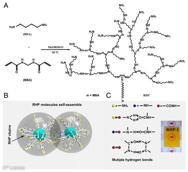 玻璃态超支化聚合物内部分子片段被高度限制,分子迁移率低,而外部支链单元和端基具有较大的迁移率。因此,作者提出通过控制聚合物的外部侧链和末端基,引入可以实现自愈的多种氢键互补基团,有助于玻璃态超支化聚合物在室温下自愈。为了证明该设想,作者首先利用N,N'-亚甲基双丙烯酰胺(MBA)和1,4-丁二胺(BDA)基于迈克尔加成反应合成了一系列无规超支化聚合物(图1)。BDA中一个-NH-可以和MBA中的一个CH2=CH-反应,通过控制-NH-和CH2=CH-的比例使得到的聚合物末端基为氨基,分别得到RHP-1、RHP-2和RHP-3(MBA/BDA分别为1/1.125、1/1和1/0.875)。这些聚合物具有大量的氨基、酰胺等基团,能够形成高密度的氢键。