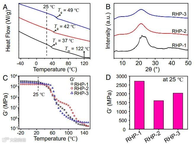 由于大量氢键的存在,这些聚合物的Tg较高,作者表征了RHP材料的热力学性质(图2)。由差示扫描量热法(DSC)表征结果可得RHP-1、RHP-2和RHP-3的Tg分别是37、42和49 °C,表明它们在室温下都是玻璃态聚合物。由XRD表征结果可得在RHP-1中有一个很尖的结晶峰,而在RHP-2和RHP-3中只有宽峰,这证明RHP-1是半晶质结构,而RHP-2和RHP-3为非晶态(图2B)。其中RHP-1的结构应该是因为支化度低和分子尺寸小,这有利于分子的有序排列。由动态力学分析可得RHP-1在25 ℃的储能模量可达2,721 MPa(图2C和D)。而25℃下RHP-3的储能模量比RHP-2的高,证明通过增加分子的尺寸和降低端基数量有助于提高材料的刚性。