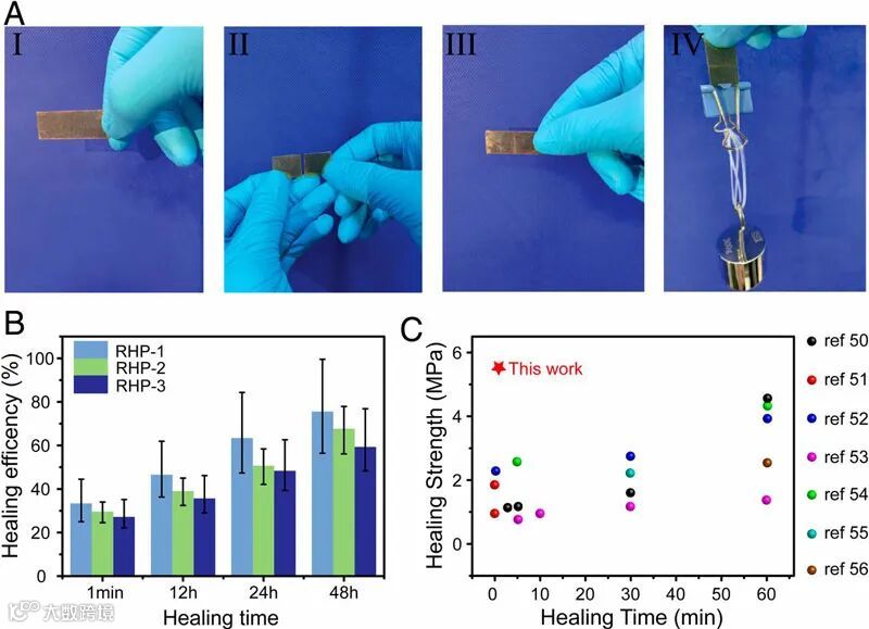 最后,为了证明RHP材料的自愈能力,作者将矩形的RHP-1(30 × 10 ×1 mm3)截断,随后将两个碎片接触1 min,发现粘到一起之后可以承受300 g的重物(图5A及前文动图)。为了研究自愈的效率,作者定量分析了不同时间的自愈程度,在自愈1 min后恢复抗张强度可达5.5 MPa,这远超过大多数的自愈材料(图5B和C)。