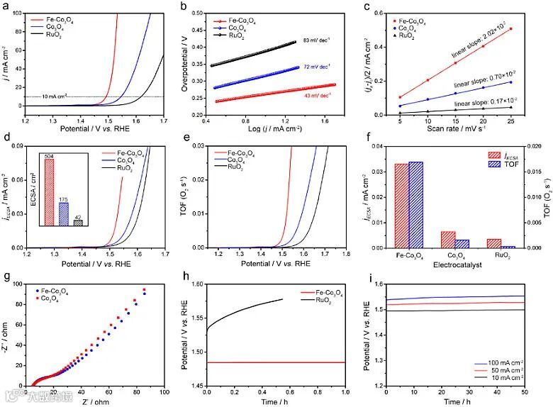 图3. 1 M KOH溶液中,催化剂OER性能评估。