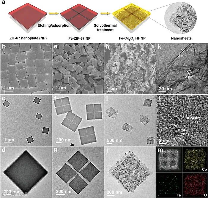 图1. a) 催化剂的合成示意图;b-d) ZIF-67 NPs的形貌结构表征;e-g) Fe-ZIF-67 NPs的形貌结构表征;h-m) Fe-Co3O4 HHNPs的形貌、结构及元素组成表征。