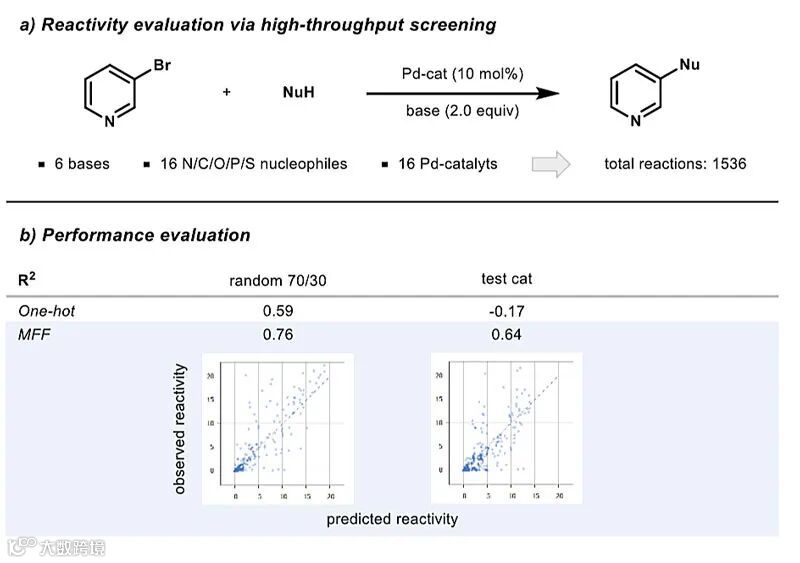 最后,他们使用了一个报道中的真实实验数据集进行应用研究。2015年,Dreher等人在纳摩量级上进行了自动化高通量筛选,以寻找适合碳-杂原子成键的条件(Science, 2015, 347, 49–53)。在钯催化下,亲电试剂3-溴吡啶与16种不同的氮、氧、碳、磷和硫亲核试剂进行偶联反应(图7a)。他们研究了16种催化剂和6种碱,在不到一天时间内进行1536次反应,并用液相色谱-质谱法(LC-MS)测定相对转化率。基于该报道的数据,Frank Glorius团队采用多指纹特征模型以类似于之前报道的产量预测方式直接预测相对转化率,结果令人鼓舞。他们的多指纹特征模型具有良好的反应预测相关性,显著高于单热编码模型(R2分别为0.76和0.59)。此外,应用多指纹特征模型还可以实现催化剂的样本外预测。利用12种催化剂的数据预测其余4种催化剂的反应均得到令人满意的结果。这证明了多指纹特征方法的通用性,及其学习化学结构和预测化学反应活性的潜力(图7)。