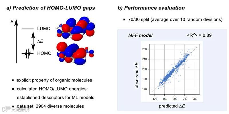 过去几十年开发的机器学习算法,大致可以分为“基于距离(distance-based)”和“非基于距离(non-distance-based)”两大类。基于距离的算法建立在“相似输入产生相似输出,反之亦然”的假设之上。然而,在有机化学中,相似的结构并不一定总能发生相似的反应。因此,他们选择非基于距离的算法,具体来说是一种多参数随机森林(random forest)算法来构建机器学习模型。接下来,他们将自己的模型应用到一系列结构不同的分子中。他们从自己研究小组化学库中选择2900多个有机小分子进行计算,结果发现多指纹特征(MFF)模型能够精确预测HOMO-LUMO能隙,10多个随机交叉验证步骤所显示的平均R2为0.89。由于HOMO–LUMO能隙是分子的一个整体性质,这说明MFF模型不仅能表征和比较分子的局部亚结构,而且能反映分子的整体特征。这个结果也支持了他们最初的假设,即(计算)分子性质最终可以回溯到(2D)Lewis结构中(图4)。