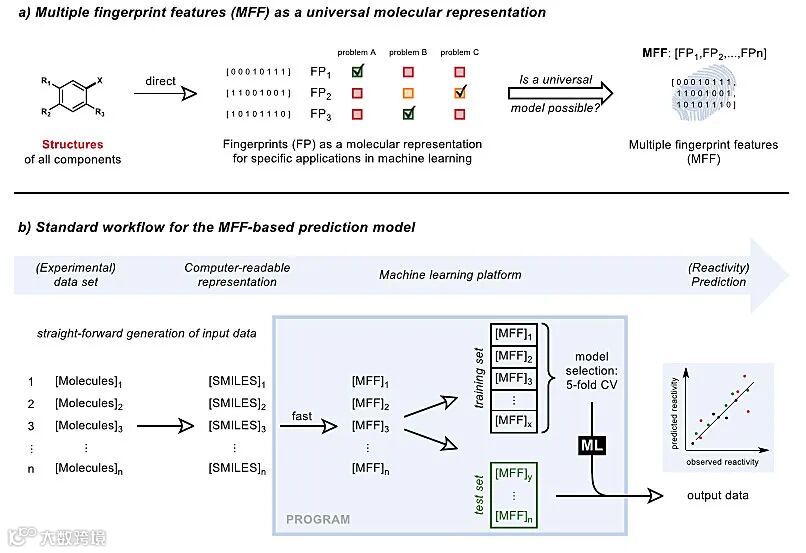 Frank Glorius团队推出的这个基于结构的机器学习平台,可以进行有机化学性质和反应性预测。这种策略仅依靠相关分子的SMILES为输入,就可将其自动转换为相应的分子指纹,所以可非常方便地用于现有问题集。具体来说,该方法为每个分子产生一个配置多样的指纹阵列(24种分子指纹)。这种多指纹特征(multiple fingerprint feature, MFF)输入与观察到的实验数据相匹配,被用于训练机器学习模型,使得该模型最终能够预测训练集之外的化学性质和反应性(图3)。