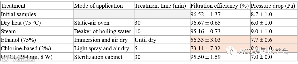 研究人员选择了高温(75℃,30分钟)、水蒸汽(将熔喷无纺布置于沸水上方约15厘米处,10分钟)、75%乙醇溶液浸泡、家用消毒水(含有2%次氯酸钠)喷洒(0.3-0.5mL)和紫外照射等5种常用的消毒措施对熔喷无纺布进行了一次性处理,然后检测了处理过后熔喷无纺布的性能变化。结果显示,75%乙醇浸泡以及含有家用消毒水处理后,熔喷无纺布的过滤性能均发生了显著下降。其他几种消毒方法对熔喷无纺布的过滤效率无影响。单次使用这几种消毒方式均没有破坏熔喷无纺布的完整性。