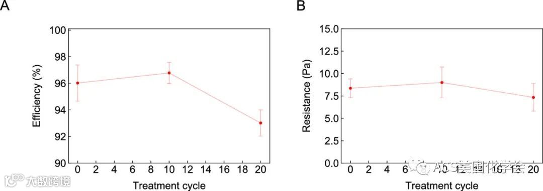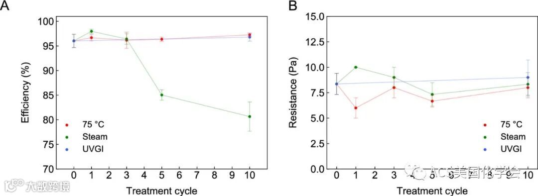 为了进一步研究多次消毒过程对熔喷无纺布过滤性能的影响,研究人员使用高温、水蒸汽和紫外照射对熔喷无纺布进行了循环多次处理,以此模拟实际使用过程中多次消毒的情景。结果显示,水蒸汽处理5次后,熔喷无纺布的过滤效率发生了急剧下降,但熔喷布的完整性并没发生变化。而高温(75°C)和紫外灯照射处理10次后,熔喷无纺布的过滤性能没有变化。