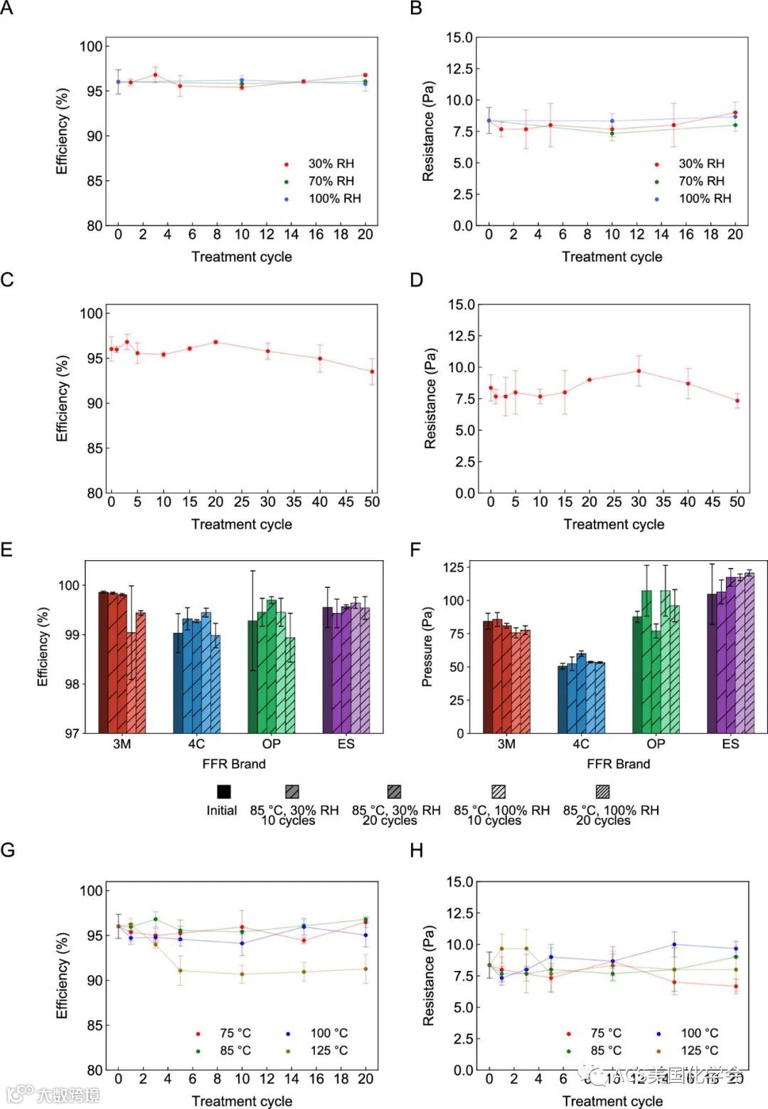 作者进一步研究了高温处理过程中湿度和温度的影响。结果表明,85°C下,不同湿度(30% RH,70% RH,100% RH)中处理20次后,熔喷无纺布的过滤性能并未发生显著下降,且其结构也未发生明显变化。85°C 30%湿度下,熔喷无纺布处理50次后,过滤性能也仅发生轻微降低。作者还对N95级别的口罩进行了同样的加热处理,其过滤性能也未发生显著下降。