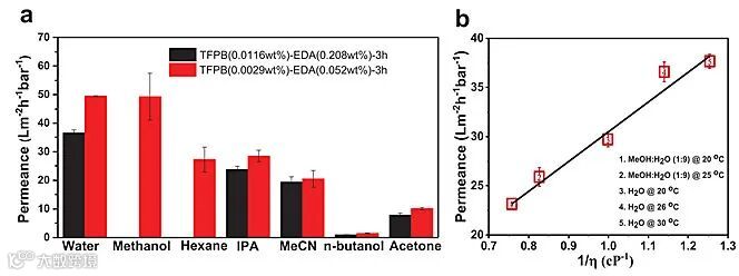 将所制备超薄聚亚胺膜制备复合分离膜体系,其耐溶剂性系统测试表明其具有优异的耐有机溶剂稳定性。在渗透性能方面,超薄聚亚胺膜纯水通量达49.5 L m-2 h-1bar-1;同时超薄膜渗透性能与溶剂体系粘度呈现良好的线性关系,符合对流理论。