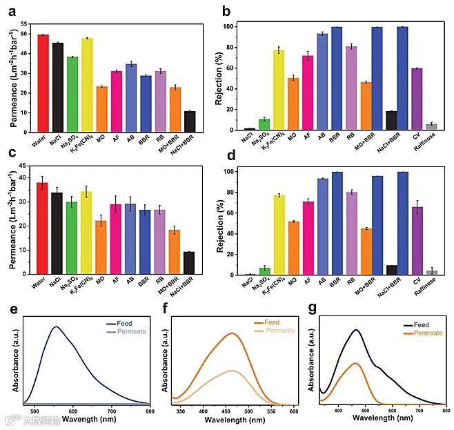 在截流分离性能方面,Na2SO4 (10.7%)、NaCl (1.8%) 截留率较低,但K3[Fe(CN)6] 截留率达70%;此外复合膜在分离带负电荷染料方面展现出优异的截留率,BBR截留率> 99%、苯胺蓝> 93%、碱性品红>70%;同时,对MO、结晶紫等也具有中等的截留率。在从水中选择性分离染料和盐混合物方面,BBR截留率>99%、NaCl截留率为16-18%;在分离不同染料混合物方面,BBR >95%、 MO >45%;复合膜整体分离性能优异。