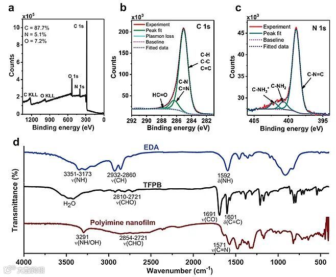 XPS元素分析显示,超薄膜原子重量百分数分别为:C 87.7%、N 5.1%和O 7.2%;其中氧元素的大量增加源自超薄膜吸附的水分。此外,研究团队对聚亚胺膜进行了详细的ATR-IR结构表征。超薄聚亚胺膜表面水接触角为70° (±3.4°),呈现亲水特性;zeta电势测试显示超薄膜表面含有极低的负电荷,zeta电势分别为-3.5和 -6.6 mV。