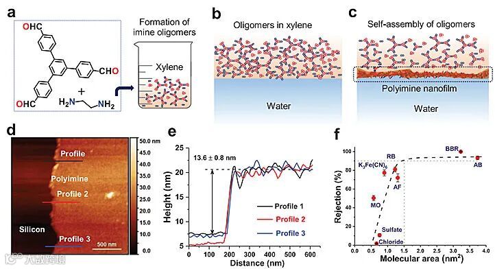 研究团队首先以1,3,5-三(4-甲酰基苯基)苯(TFPB)、乙二胺(EDA)为单体,在二甲苯溶剂中反应1 h制备亚胺齐聚物悬浮溶液;将上述二甲苯溶液体系倒入水溶液中构筑两相界面,基于水催化的界面缩聚、齐聚物自组装形成具有交联网络结构的纳米级超薄聚亚胺膜。界面缩聚反应3 h所得聚亚胺薄膜,AFM测试其厚度约为14 nm。同时,系统研究表明在二氯甲烷-水、三氯甲烷-水体系界面亦可自组装制备超薄聚亚胺膜。