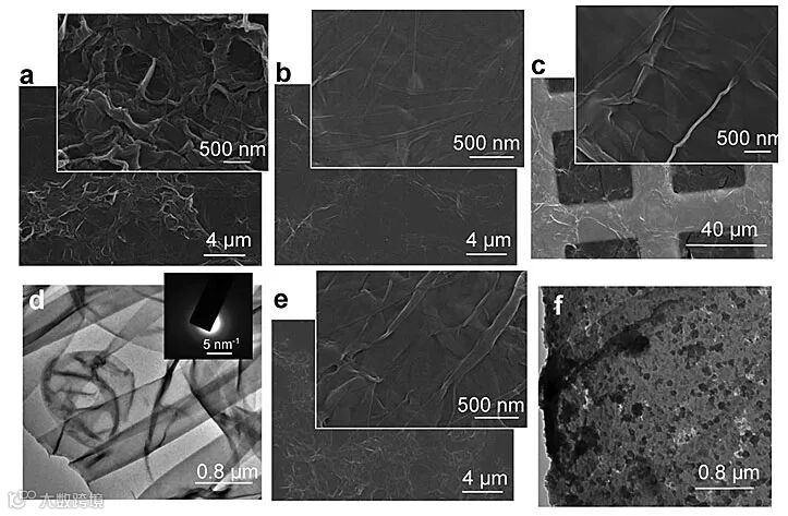 作为对比,研究团队采用传统的界面聚合方法(EDA水溶液-TFPB+乙酸二甲苯溶液)制备超薄聚亚胺薄膜。SEM测试显示,传统界面缩聚16 h制备的聚亚胺薄膜表面呈现大量褶皱形貌;而采用亚胺齐聚物界面缩聚自组装制备超薄聚亚胺膜(厚度约14 nm)其反应时间缩短至3 h、超薄膜面积可达几百平方厘米,SEM测试显示薄膜表面较为光滑、平整,表面有局部凸起结构,电子衍射图案显示聚亚胺薄膜为非结晶无定形态。同时,AFM测试显示聚亚胺单层薄膜厚度基本约16 nm,表明齐聚物界面缩聚3 h后膜层厚度有效抑制了厚度方向薄膜的进一步生长。以PDMS为基底、基于表面起皱技术,测得超薄模量约为12.3 MPa。