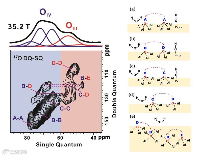 近日,中国科学院精密测量科学与技术创新研究院(原中国科学院武汉物理与数学研究所)徐君和邓风研究团队在γ-Al2O3氧物种微观结构研究方面取得新进展,利用35.2 T(1.5GHz)的超高强磁场,结合所发展的先进二维固体NMR谱学方法揭示了γ-Al2O3表面和体相中氧物种的结构及其空间关联。