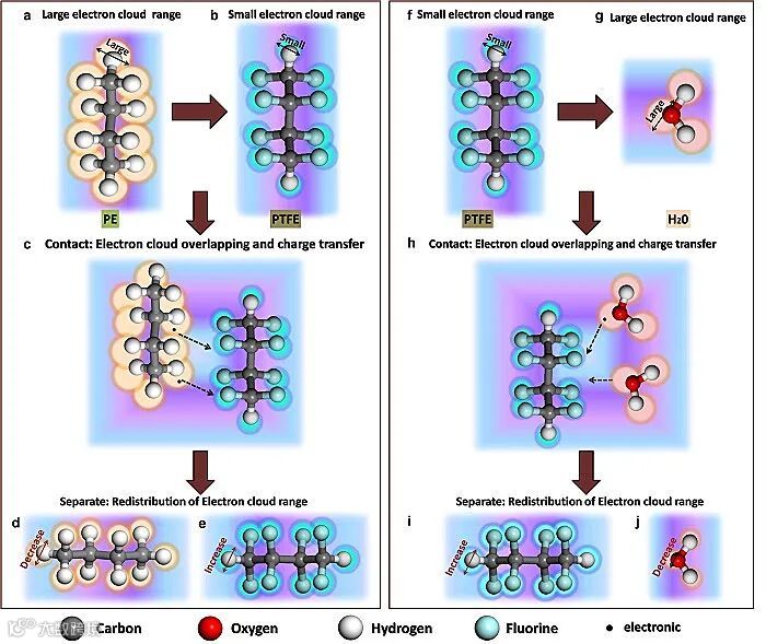 图1. 固固与固液模型中CE的电子转移。分为接触分离两个阶段,接触期间电子从范围大的电子云向范围小的电子云转移电子,电子跃迁导致电子云达到平衡。