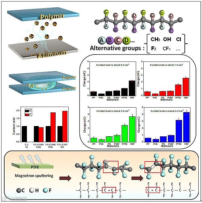 图2. 使用一系列具有相似主链但侧链上具有不同官能团的聚合物薄膜来阐明官能团对固固和固液的CE贡献。具有强吸电子能力的聚合物(PTFE和FEP)在固液CE期间也可以产生明显的电子转移效果。PTFE的不饱和基团(-CF = CF2或-CF = CF-)具有比主链上常见的-CF2基团更强的吸电子能力。