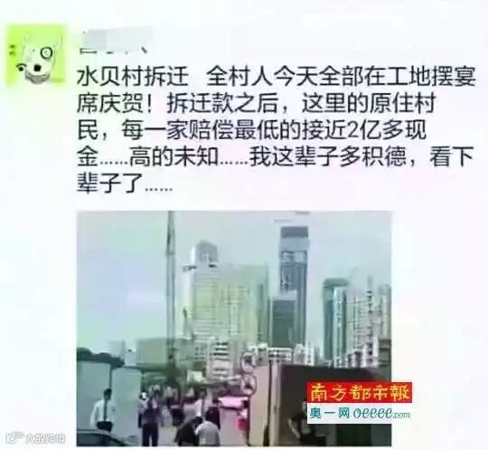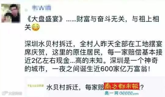 正在推进城市更新改造的深圳罗湖区水贝村,前晚在项目工地上摆了530桌大盆菜宴,这一新闻经南都独家报道之后,引起社会广泛关注。昨日,不少中介在朋友圈转发该新闻时评论称,“这里的原住村民,每一家赔偿最低的接近2亿现金,高的未知”,一石激起千层浪。事实真相到底如何?昨日水贝实业股份有限公司与负责水贝村城市更新改造项目的京基集团均向南都记者辟谣称,上述言论纯属谣言。>>>【假的!深圳水贝村拆迁每家赔2亿 83个姑娘未嫁】