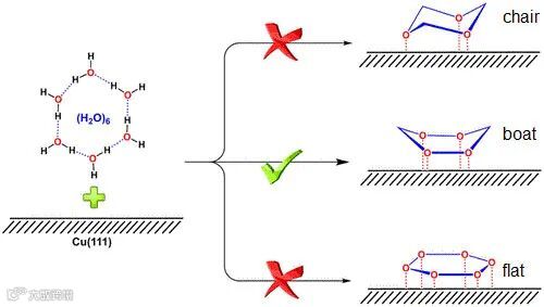 水六聚体在铜表面上的吸附是研究水簇在固体表面吸附的理想模型体系。人们对于该体系的深入研究已接近20年。人们根据化学直觉和实验STM的观测结果,推测Cu(111)上水六聚的原位吸附结构为平面构型(见下图的flat构型)。另一方面,广义梯度近似(GGA)级别的密度泛函理论(DFT)计算表明,水六聚体的椅式结构具有全局最小能量(下图中的chair构型)。因此,以前的STM实验和DFT理论之间并未达成一致,Cu(111)表面水六聚体的最稳结构仍存在着巨大的争议。试想,如果STM实验观测到的,不是水六聚体的最稳结构,那么,这削弱了STM作为一个研究表面水结构的强有力工具的作用;另一面,如果一些DFT泛函不能预测水六聚体的最稳结构,那么,这削弱了这些DFT泛函作为研究表面水结构的作用。而这些都阻碍了人们对水固界面的认识。
