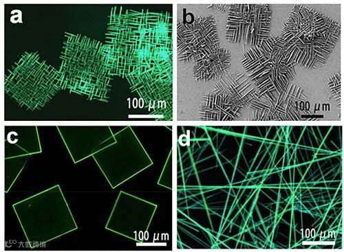 图2. BP-1,3DTFB共晶二维纳米棒网格的 (a) 荧光显微镜、(b) SEM照片及BP (c) 和BPBP-1,3DTFB共晶 (d) 的荧光显微镜照片。