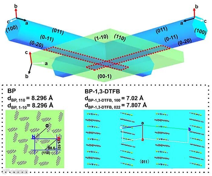 接下来作者研究了BP与BP-1,3-DTFB的晶体外延关系,揭示了二维纳米棒网格形成阵列的形成原因。如二维纳米棒网格的生长晶面示意图中标注所示(图3),其中BP晶胞的ab-plane和BP-1,3-DTFB的ac-plane在其表面相连。在此区域,作者根据两者的晶体结构发现,在BP晶体中,BP分子沿[110]和[1-10]方向以等效晶格距离(d110 = d1-10 = 8.296 Å)堆积。BP-1,3-DTFB共晶中的BP分子和1,3-DTFB分子沿电荷转移方向在暴露的(011)面 (d022 = 7.807 Å)交替堆积。值得注意的是,dBP-1,3-DTFB,011几乎是dBP,110或dBP,1-10的两倍,而BP与BP-1,3-DTFB之间较小的的晶格失配率(f=5.9%)满足晶格匹配的条件,从而BP-1,3-DTFB纳米棒可以在BP微片表面沿100方向外延生长。考虑到BP微片的侧面为等晶面间距的(110)/(1-10)面,因此BP-1,3-DTFB纳米棒将在表面垂直排列成正交的纳米棒阵列。