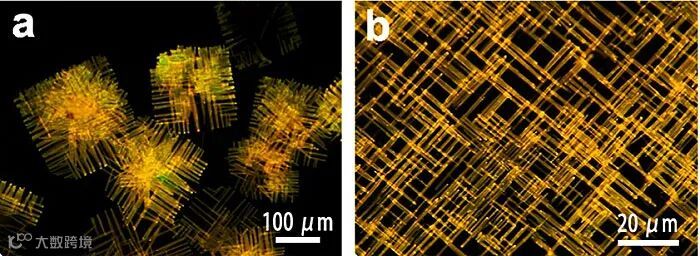图4. (a-b) BP-1,4DTFB共晶二维纳米棒网格的荧光显微镜照片。