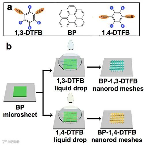 图1. 苯并苝微米片晶体转化形成的二维纳米棒网格的示意图及相应给受体分子对分子结构。