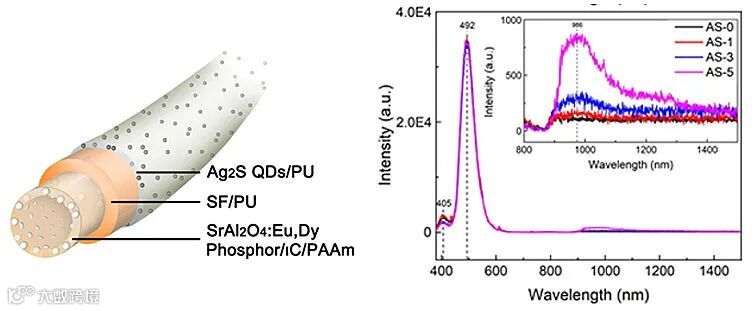 在初试样品里,选择近期发展的同轴湿纺蚕丝载体,把稀土掺杂的铝酸锶微米颗粒嵌入内层,有较好生物安全性的硫化银量子点包覆在外层。在无光环境中,激发过的纤维也能持续发射绿光(492 nm)和近红外光(986 nm),超过10小时以上。对短时间激发的纤维样品,在暗室里可以用高精度温度探针测出该纤维平纹布比未激发样品高出0.005摄氏度。这种纤维的光学性质在各种常见压力、湿度和水洗条件下都能保持稳定持久。目前近红外荧光转换效率比较低,但是随着新型荧光材料的发展,这一新结构的性能还有很大的提升空间。