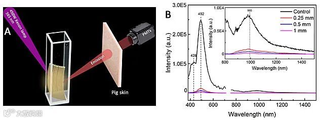 早在2011年,该课题组便开始聚焦于皮芯结构的纤维平台,发展调控及感应伽马射线、X-射线、紫外光、可见光及红外光的特种纤维。近年来受到人体诊疗领域的近红外光应用和太阳能可持续利用研究的启发,该课题组瞄准人体表皮的近红外窗口,把纤维光源的能量传递延伸到表皮以下的血液循环系统,提升光能利用效率(图2)。基于长余辉粉体的光能延迟释放性质,这种近红外波段的能源输送可以在黑暗环境中持续,减弱日夜交替大幅环境温差给人体带来的负面影响,尤其有助于干燥的沙漠地区用户。