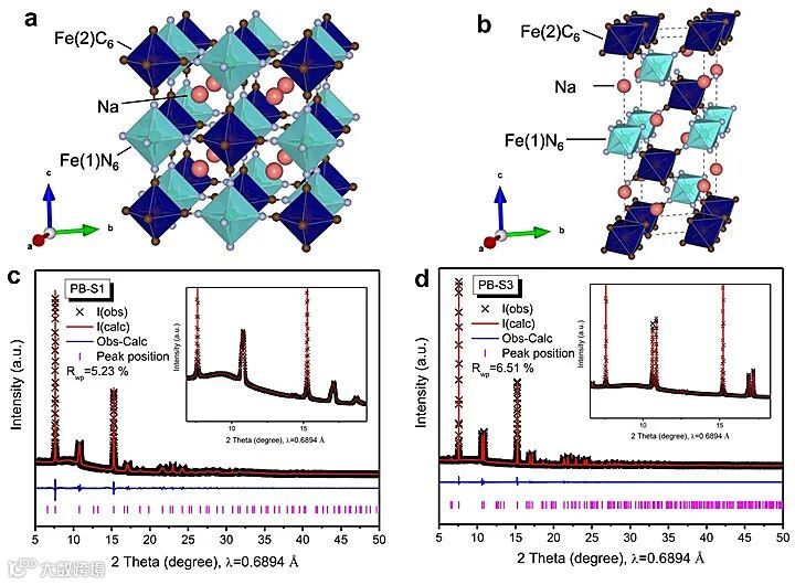 通过对沉淀反应过程的调控,作者合成了一系列铁基普鲁士蓝样品。通过初步的物相分析后,选取其中分别代表立方相PB-S1和菱方相PB-S3的2个样品,进行同步辐射粉末XRD表征及结构精修,结果如图1所示。材料中钠含量的提升使结构由立方相向菱方相转变。