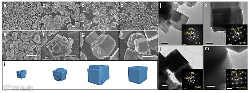 选取了形貌不同的4个材料来表示高结晶度铁基普鲁士蓝的演变过程,分别呈现于图2 a-d中,对应的放大图位于e-h中。沉淀反应过程中,保持惰性气氛,添加络合剂,调控反应物浓度,可以有效防止Fe2+的氧化,减缓反应速度和补充钠源,有利于提高材料的结晶度和钠含量。其中,柠檬酸钠起到最重要的作用,同时作为络合剂和补充钠源,当逐渐提高用量时,有利于材料一次颗粒的长大,普鲁士蓝材料由纳米堆积立方颗粒渐向微米级单一立方体形貌转变,晶型也由立方相向菱方相转变。