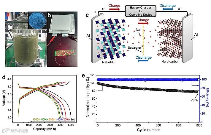 为了论证扩大生产的可行性,作者基于PB-S3样品进行了放大合成,经过一系列调整,在100 L反应釜中成功制备出公斤级富钠菱方相普鲁士蓝材料(图5a),利用所得到的普鲁士蓝材料和商业化硬碳负极组装成了软包电池,展现出长达1000次的稳定循环性能。