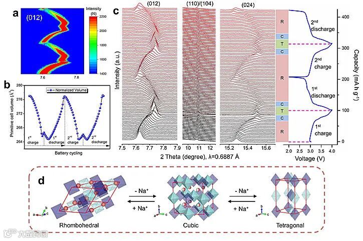将立方相PB-S1和菱方相PB-S3样品分别组装成半电池,对电化学性能进行了详细研究。得益于菱方相材料更高的结晶度和较高的钠含量,菱方相的PB-S3样品具有高达97.4%的首次充放电效率以及更优异的循环性能和倍率性能,钠离子扩散系数也高于立方相PB-S1样品。利用同步辐射原位XRD技术对菱方相PB-S3样品进行了充放电过程中的结构变化分析。如图3所示,在完整的2次充放电过程中,材料的结构在菱方相,立方相和四方相之间高度可逆转变,由此揭示了菱方相普鲁士蓝优异的循环稳定性。
