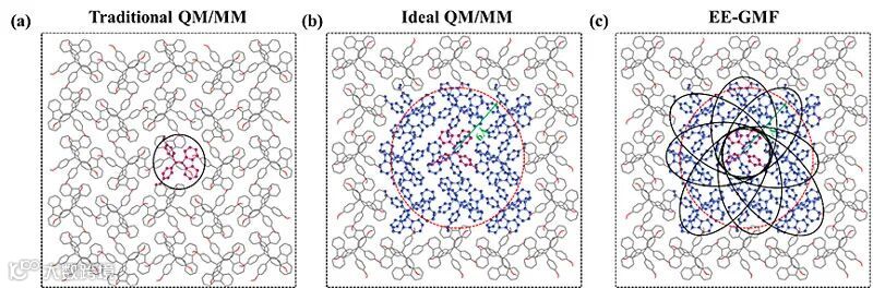 图2. (a)对于传统QM/MM方法,只有中心分子(紫色)包含在QM区域内,其他所有分子都用电荷来描述。(b)对于理想的QM/MM方法,中心分子和周围分子(距激发中心6.0 A以内,蓝色)都包含在QM区域内,而晶体环境中的所有其他分子都用电荷来描述。理想的 QM/MM模型的计算成本超出了传统QM计算的极限。(c)对于EE-GMF方法,以中心片段为激发中心,采用多体展开法处理附近分子与激发中心之间的QM相互作用(二体分子间的量子力学相互作用)。