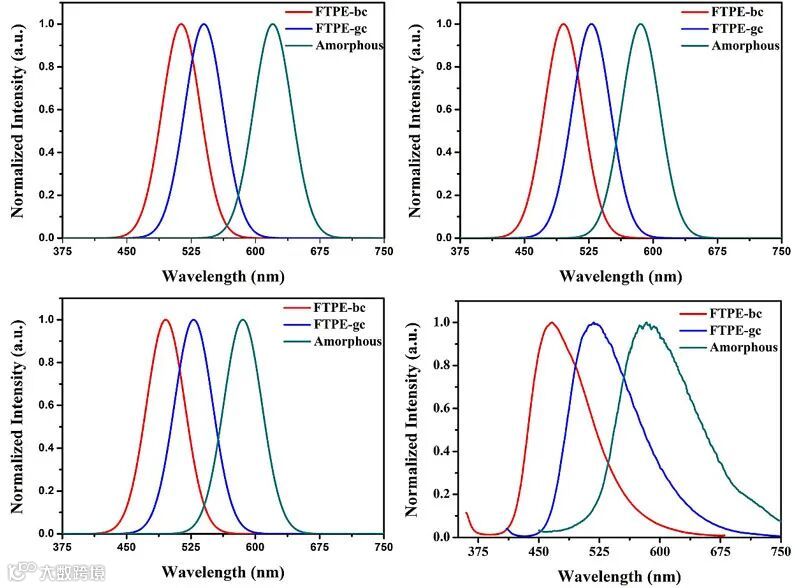 图1. 基于单体计算(a)、QM/MM方法(b)和EE-GMF方法(c)计算了FTPE在凝聚相中的发射光谱。(d)实验测量获得的FTPE的发射光谱。(所有的光谱都是用归一化的强度绘制的)