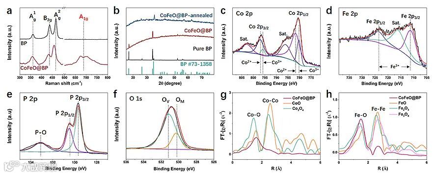 Figure 2. a) Raman spectrum of pure BP and CoFeO@BP nanosheets. b) XRD pattern of BP, CoFeO@BP and thermally annealed CoFeO@BP. c to f) High-resolution XPS spectra of Co 2p, Fe 2p, P 2p and O 1s for CoFeO@BP. g & h) EXAFS spectra of Co and Fe K-edge for CoFeO@BP together with various references.